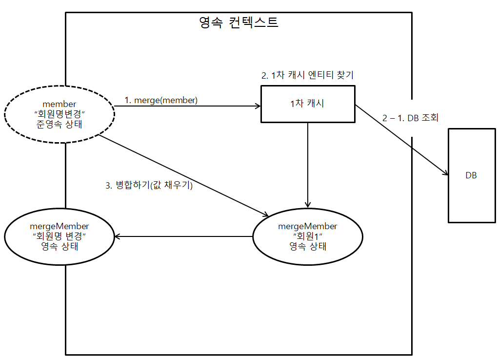 - 조회한 영속 엔티티와(mergeMember)와 준영속 엔티티(member)를 병합 합니다.